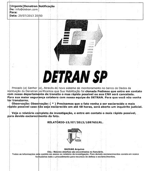 Muita gente recebeu uma mensagem via e-mail contendo um documento como o da ilustração. A mensagem diz que o Detran descobriu que a Carteira Nacional de Habilitação (carteira de motorista) da pessoa que recebeu a mensagem foi clonada e orienta para clicar num link para obter mais informações. A mensagem diz que o link abre um arquivo anexo contendo um relatório de investigação do caso, e que o interessado deve entrar em contato com o Detran dentro de 48 horas.